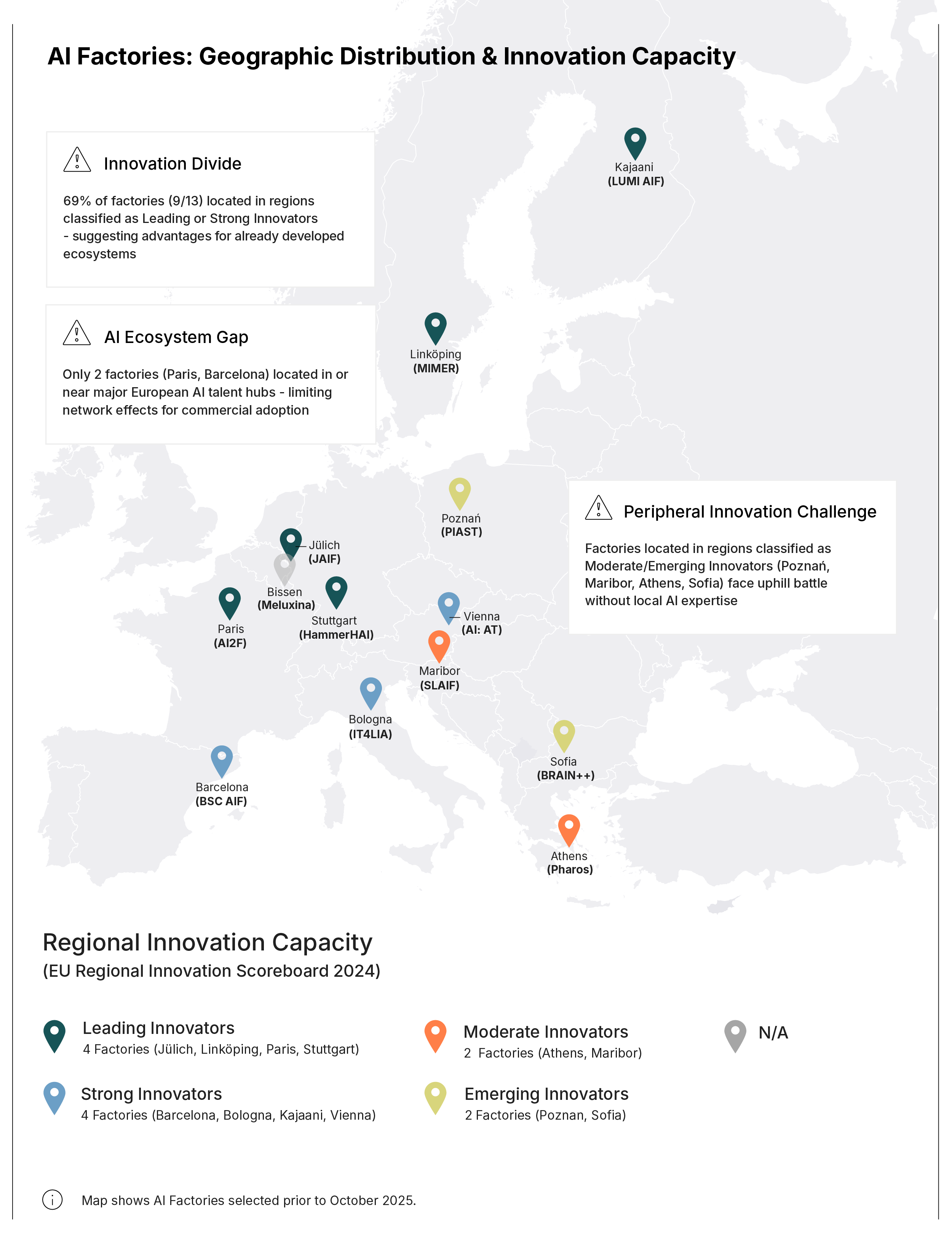 This is all the more important considering AI factories differ regarding the innovation capacities of the region they are located in. AI factories are mostly located in regions with strong innovation capacities. According to the EU Regional Innovation Scoreboard, five factories are situated in leading innovator regions, four in strong innovator regions, and four in moderate or emerging regions. About half of the factories are situated in urban centres, including four in capital regions and three in other metropolitan areas, while the remainder are in rural or hybrid regions. The more urban locations generally correspond to regions with higher economic productivity. AI factories in regions with higher innovation and economic capacities stand a better chance at making an impact on the AI ecosystem (see also infobox 1). However, consortia partners may influence or support factories located in moderate or emerging innovation regions, helping to increase ecosystem capacity by infusing new expertise and networks into an AI factory.