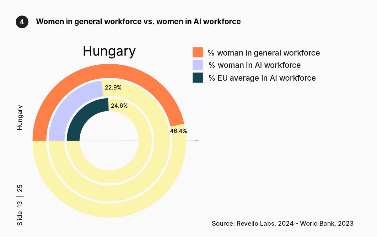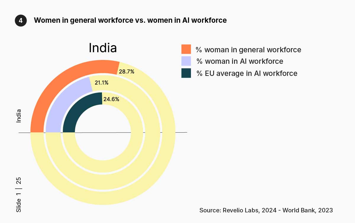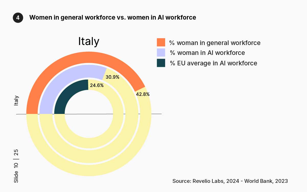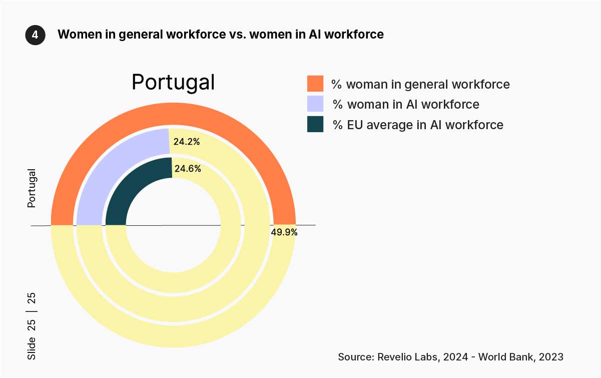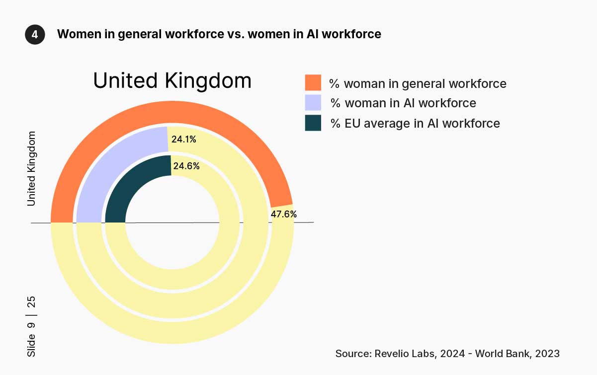This gender gap in AI talent pools is significantly more pronounced than in the overall workforce. In countries like Portugal and Estonia, which have achieved near gender equity in their general labor force, the AI sector shows dramatic imbalances of up to 51%. Even in leading AI hubs, diversity remains a challenge. In Frankfurt, a major European tech center, just 19% of AI talent is female. Milan leads among European AI hubs with 30.7% female AI professionals, still far from parity. This underrepresentation of women in AI has serious implications, potentially exacerbating biases in AI systems and limiting innovation 2 3 4 . While having more women and underrepresented groups in AI won't automatically fix existing biased data sets, it will drive a push for more diverse and representative data collection over time. Diverse teams are more likely to question the status quo, recognize gaps in data collection, and advocate for more inclusive practices.