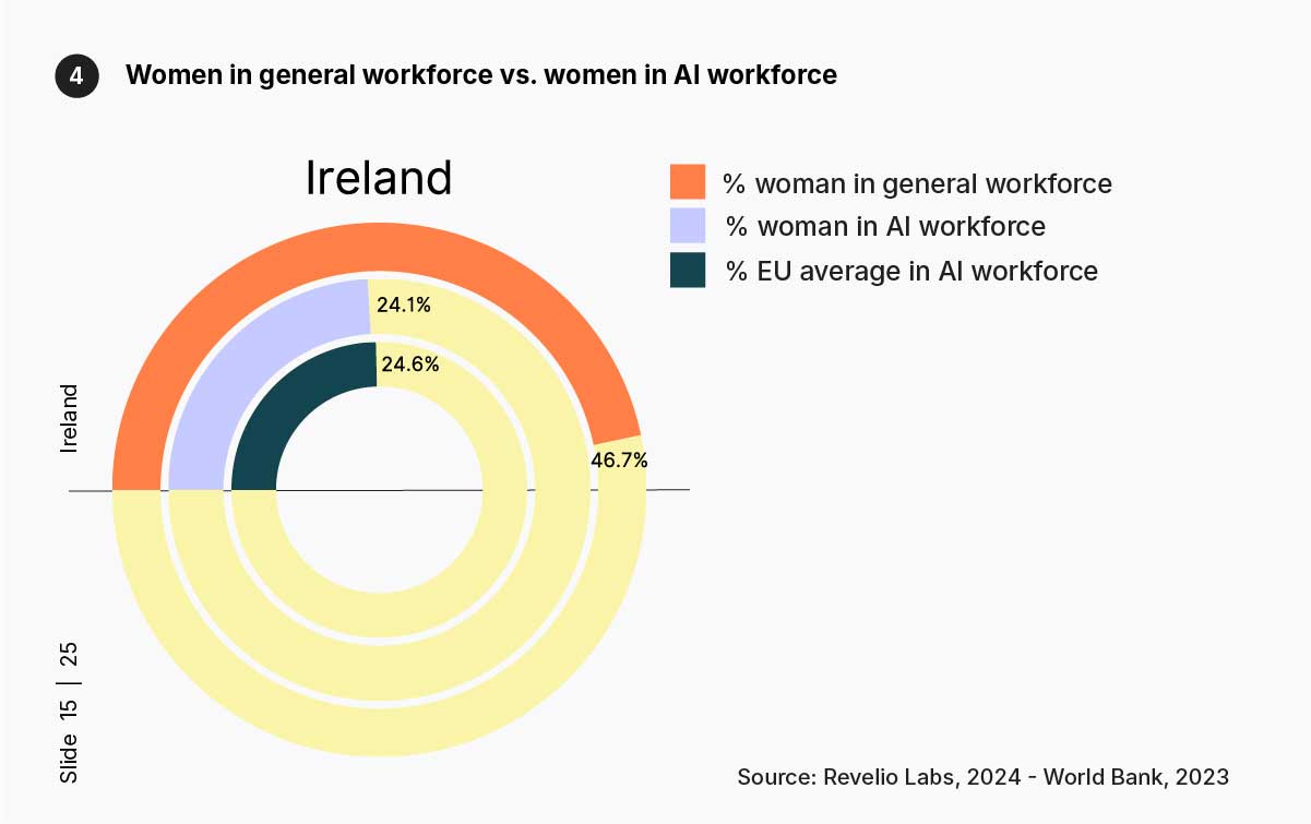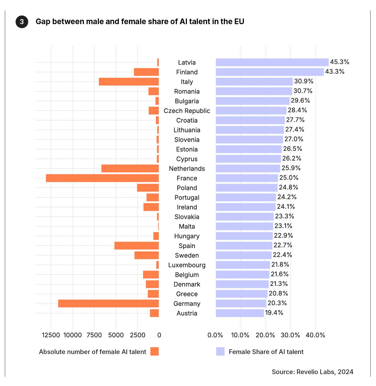 Within the European Union, the gender disparity in AI talent varies widely. While countries like Latvia and Finland have achieved over 40% female representation in AI, major economies like Germany lag behind, with women making up only about 20% of AI professionals.