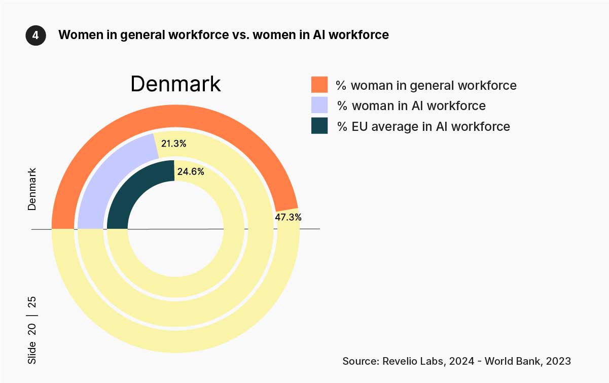 Our analysis of data on nearly 1.6 million AI professionals worldwide reveals stark gender imbalances. Women comprise only 22% of AI talent globally, with even lower representation at senior levels – occupying less than 14% of senior executive roles in AI. Within the EU, the disparity is equally concerning. Europe has closed 75% of its gender gap 1 , with Sweden and Germany among the top five European economies in closing the gender gap. However, our data reveals a stark contrast in the AI sector: Germany and Sweden have some of the lowest female representations in their AI workforces in the EU, at 20.3% and 22.4% respectively. This discrepancy raises serious questions about the unique barriers faced by women in the AI field.