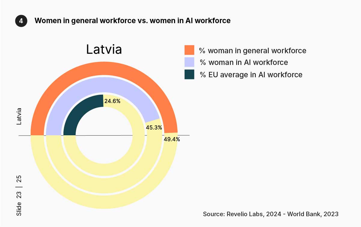 For instance, nearly half of Latvia's AI professionals are female, reflecting the country's labor market in STEM. Latvia has one of the highest shares of women in scientific personnel (49.6% in 2020) and is one of the few EU countries where women outnumber men in science and engineering professions, a trend also seen in Lithuania and Bulgaria 30 31 . Latvia's achievements in gender parity in the AI labor market may result from proactive policy efforts toward gender equality. In 2018, Latvia implemented the “Plan for the Promotion of Equal Rights and Opportunities for Women and Men for 2018-2020,” which was renewed for the period 2021-2023. This plan includes measures to eliminate gender stereotypes and challenge traditional gender roles 32 , which have been identified as significant factors contributing to gender gaps in STEM 33 .