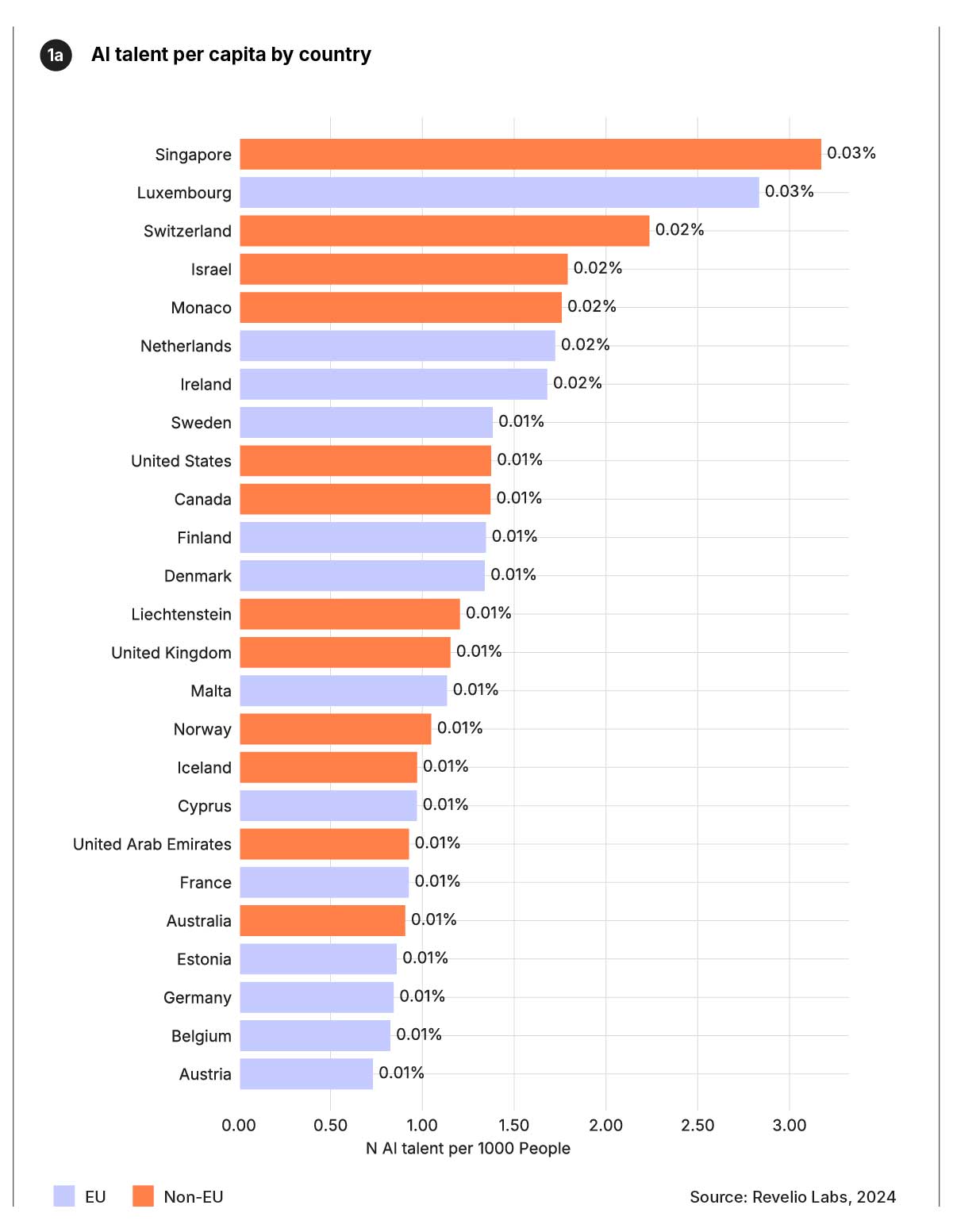Singapore leads the nations studied in this paper with the highest concentration of AI talent per capita, closely followed by Luxembourg, which tops the EU rankings. The Netherlands, while second in AI talent density within the EU, secures the sixth position globally. This data illustrates the diverse distribution of AI expertise across both EU and non-EU countries, highlighting the global competition for AI talent. Notably, several EU member states surpass the United States in AI talent concentration, reflecting Europe's strong position in boasting a significant AI talent pool.