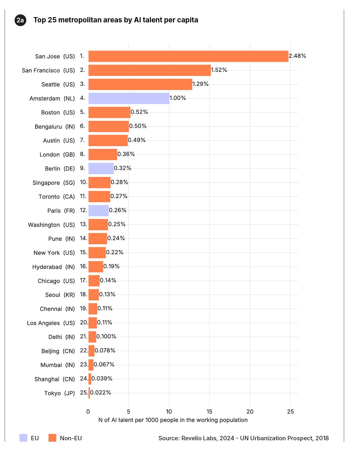 The United States dominates the landscape of AI talent hubs, with San Jose, San Francisco, and Seattle claiming the top three positions globally. San Jose leads the pack with an impressive ratio of nearly 25 AI professionals per 1,000 workers. San Francisco and Seattle follow, boasting 11 and 10 AI specialists per 1,000 workers, respectively. In contrast, the European Union's presence in the top 25 hubs is limited to just three cities. Amsterdam stands out as the EU's premier AI hub, ranking fourth globally, while Berlin secures the ninth spot worldwide and second within the EU. Interestingly, Paris, which leads the EU in absolute numbers of AI talent, ranks third in the EU and 12th globally when adjusted for population size.