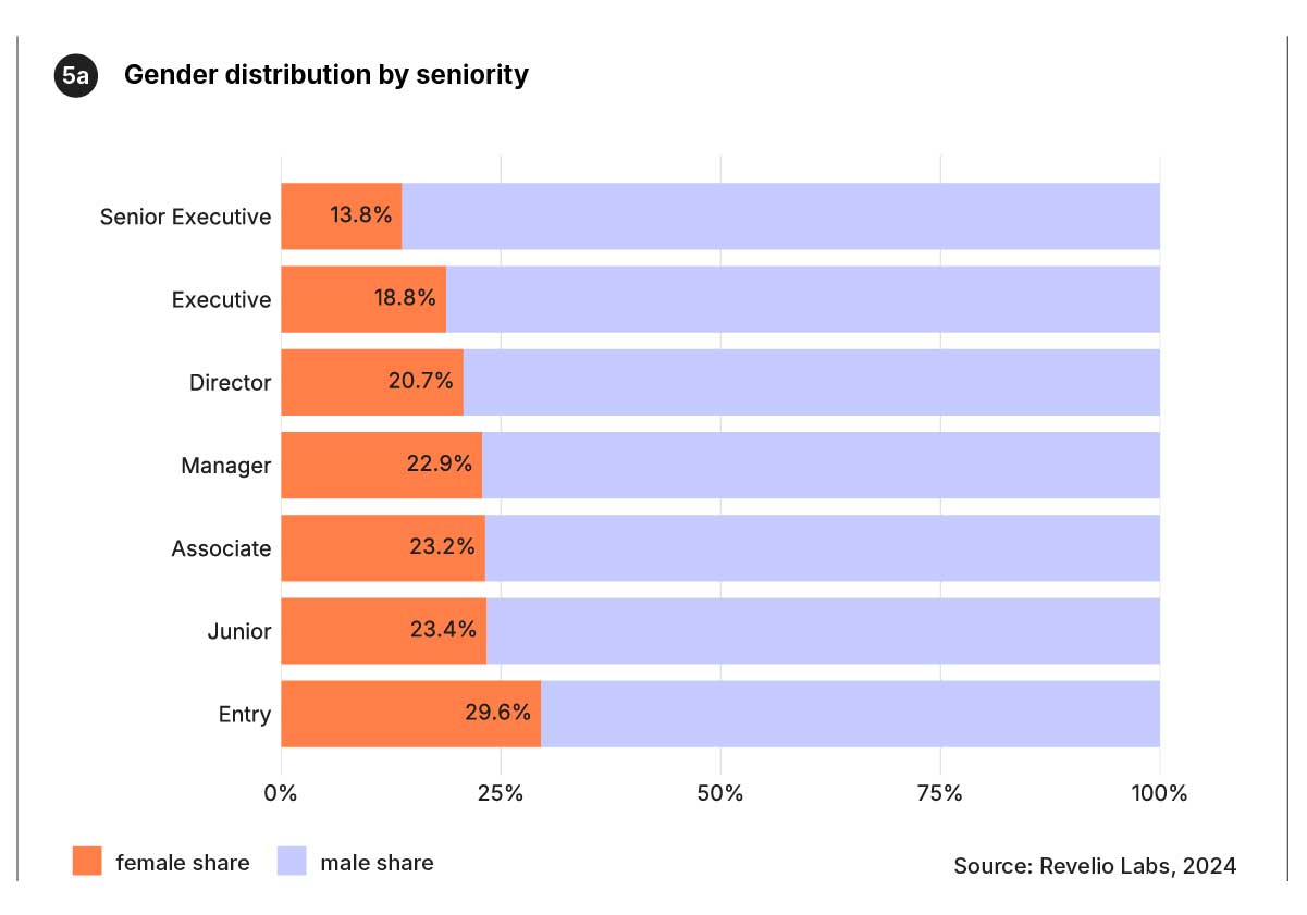 The graph illustrates the gender disparity in AI talent, highlighting not only the imbalanced proportion of women in AI professions but also their diminishing representation at higher seniority levels. At the Entry Level, women comprise approximately 29% of AI workers, already indicating a significant gender imbalance considering that women represent half of the global population. This disparity widens as seniority increases, with women occupying less than 15% of Senior Executive roles in AI.