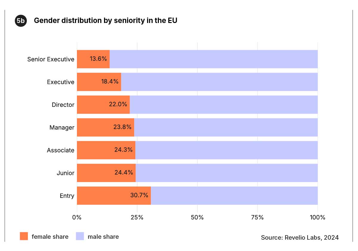 Revelio Labs predicts gender based on first names using a model trained on social security administration data. If a name has a probability above 50% of being female, the individual is counted as female in this analysis. Individuals without a predicted gender (2.1% in the EU data) are omitted from this analysis. It is important to acknowledge that predicting gender based on names is not always accurate, and readers should keep this limitation of the data in mind.