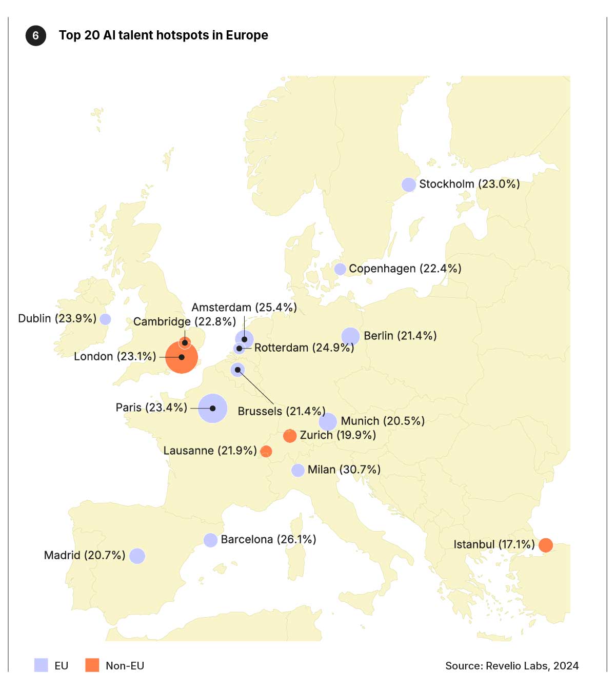 This map highlights European AI hubs, with percentages indicating female representation in each city's AI workforce. The size of the dot represents the size of the hub in terms of the number of AI professionals in the city.