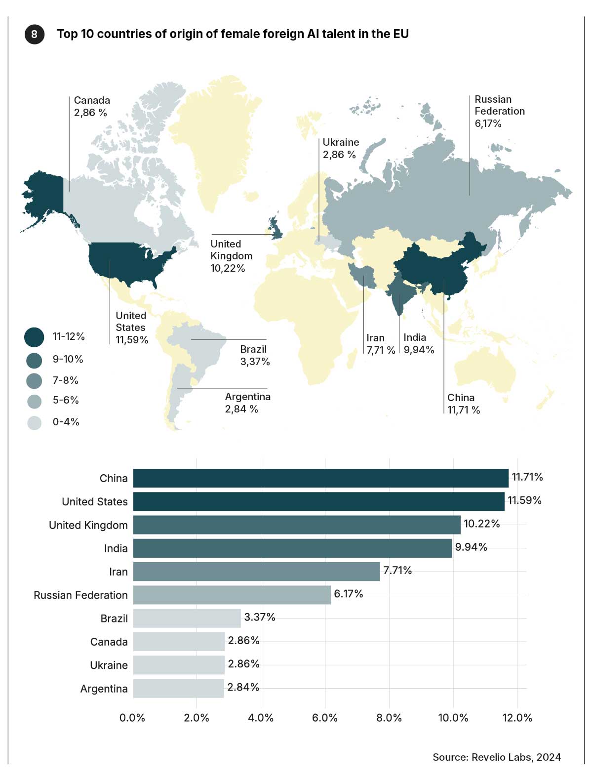 The data suggest a strong presence of talent migrating to the EU from the Global South with India leading at 12.10%, followed closely by China (11.16%). There is also significant talent inflow from the US (10.45%) but it is highly likely that these are EU nationals returning after studying/working in the US. The UK's strong presence (9.81%) post-Brexit suggests enduring ties in the AI sector. The diversity of source countries, including Iran (7.60%), Russia (4.93%), and emerging tech nations like Brazil (3.93%) and Egypt (3.29%), highlights the EU's appeal as a destination for AI professionals worldwide. This distribution reflects the EU's success in attracting talent from both established and developing tech ecosystems. The presence of countries like Pakistan (2.73%) and Argentina (2.52%) in the top 10 indicates a broad "brain gain" for the EU. The data reveals existing talent pipelines, indicating significant potential for further expansion of skilled labor immigration through strategic and forward-thinking labor market policies. Simultaneously, it's crucial to emphasize the importance of cultivating and advancing the domestic talent pool to create a balanced approach to AI workforce development.