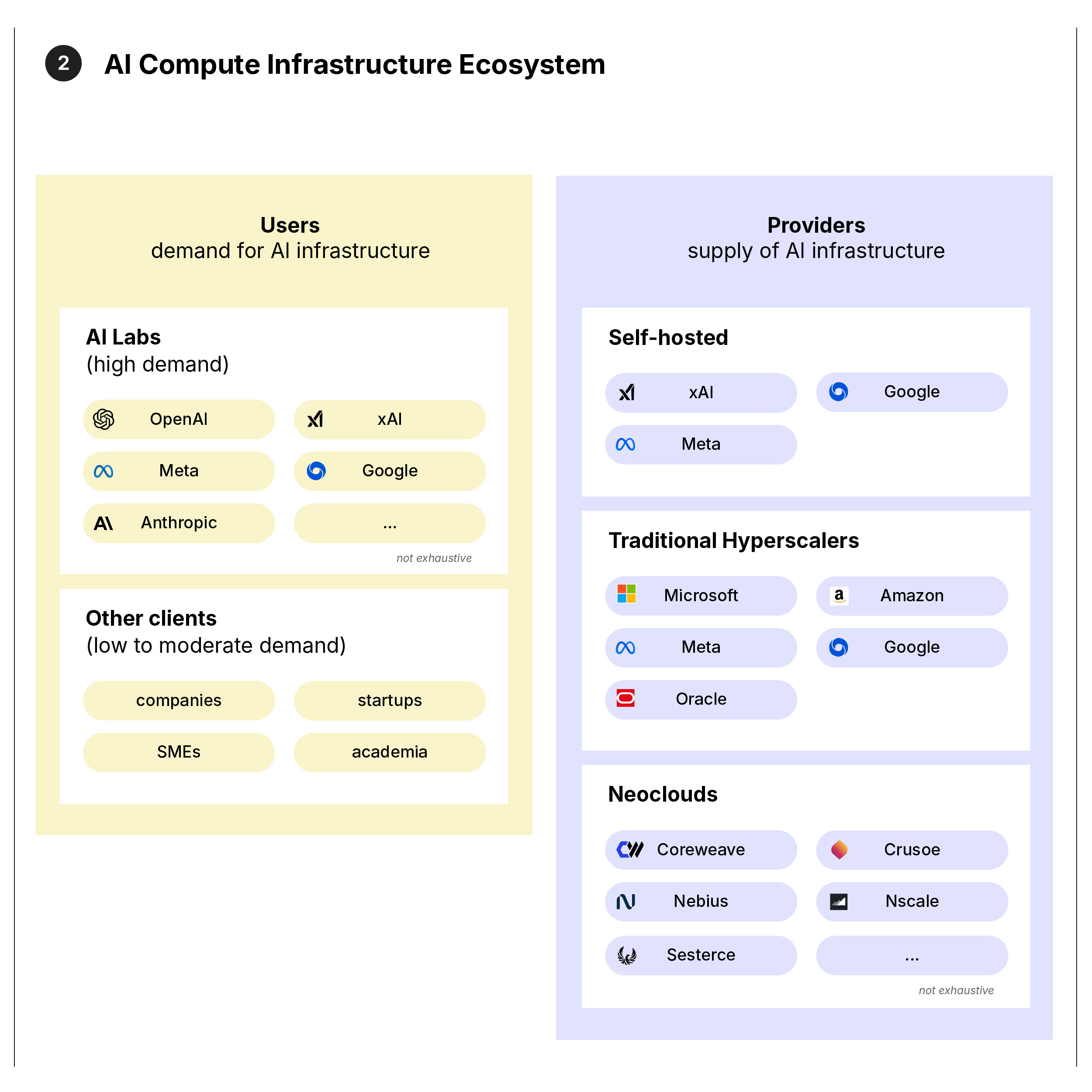 Users of AI compute infrastructure can be separated into two groups: first, a small number of AI labs that have developed large models, such as Open AI, xAI, Meta, Google, Anthropic, Mistral or DeepSeek. 26 They comprise a mix of newly established labs often backed by hyperscalers (e.g., Anthropic-Amazon, OpenAI-Microsoft) and labs operated by hyperscalers themselves (e.g., Google, Meta). They lead advanced AI model development and pursue multiple strategies to meet their high demand for AI compute for both training and inference.