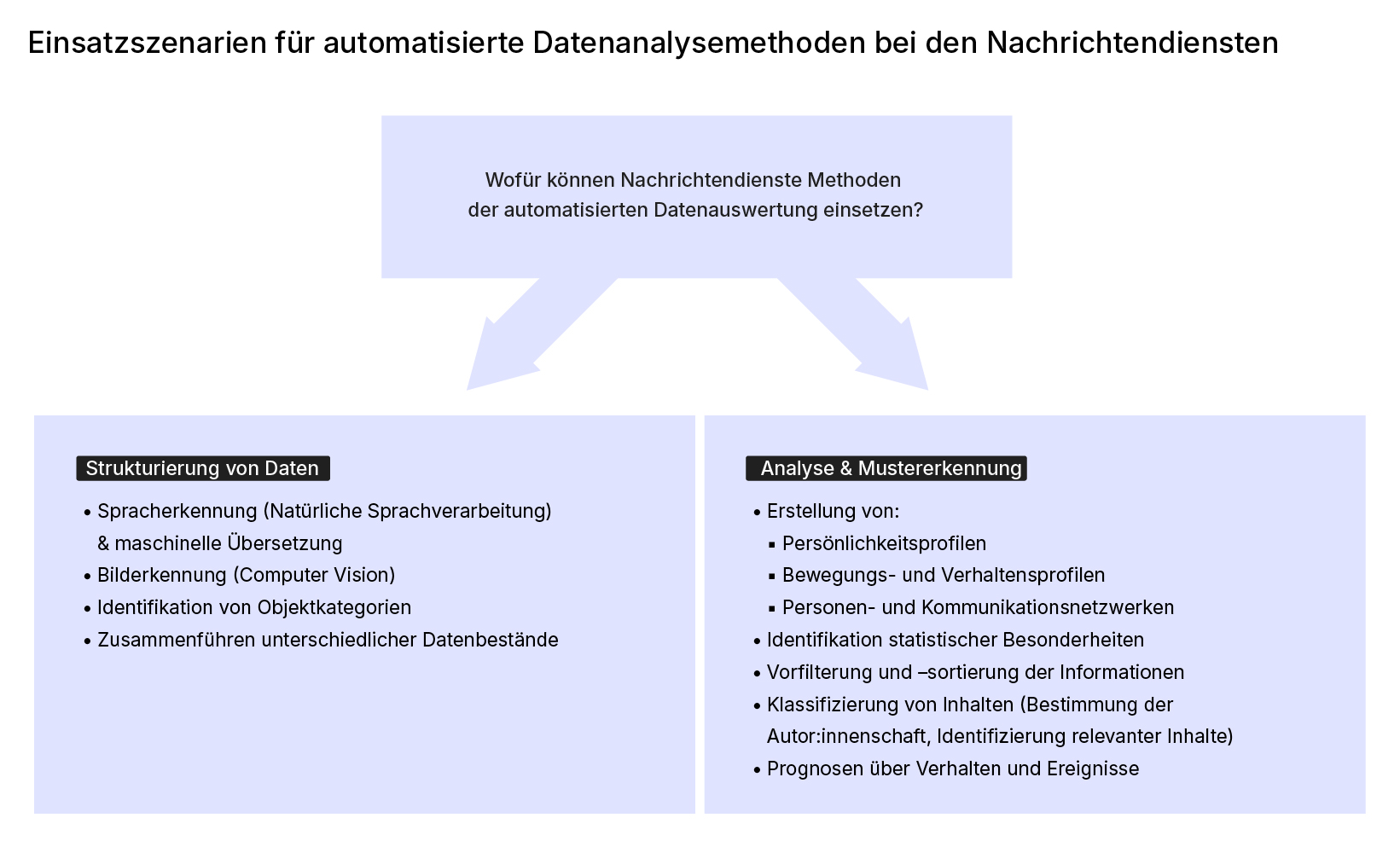 Um die wachsenden Datenmengen auch auswerten zu können, suchen die Nachrichtendienste deshalb nach technischen Lösungen. Hier kommen die Werkzeuge zur automatisierten Auswertung großer Datenmengen ins Spiel. Deren Einsatz kann allerdings tief in Grundrechte eingreifen. Um besser zu verstehen, inwiefern Grundrechte wie das Recht auf informationelle Selbstbestimmung verletzt werden können, richten wir im Folgenden zunächst einen Blick darauf, welche Art von Werkzeugen Nachrichtendienste weltweit verwenden. Die unterschiedlichen Einsatzzwecke werden weiter unten auch in Abbildung 1 dargestellt.