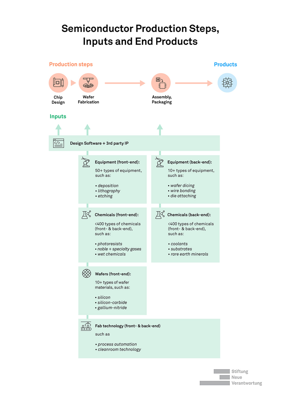 Inputs consist of the supplier markets for each production step, such as electronic design automation (EDA) tools, chemicals, equipment, wafers, process automation, and cleanroom technology. As an example, there are around 50 different types of manufacturing equipment and up to 400 different chemicals from upstream supplier markets that have very different characteristics and dynamics. 19