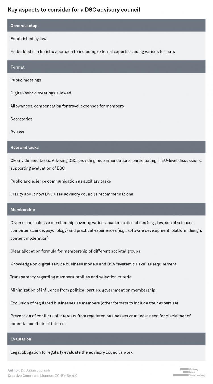 To include external expertise in Germany’s enforcement efforts, the draft law proposes an advisory council comprised of experts from academia, civil society, consumer protection and business. This is a welcome step, yet several improvements should be made. The following table summarizes key aspects to be considered when establishing any DSC advisory council.