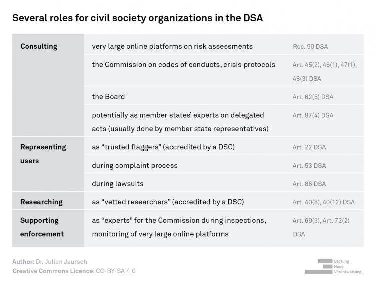 The public comment emphasizes the role experts from academia and especially civil society play in DSA enforcement. As the following table shows, civil society groups can fulfill various roles in overseeing compliance with the DSA.