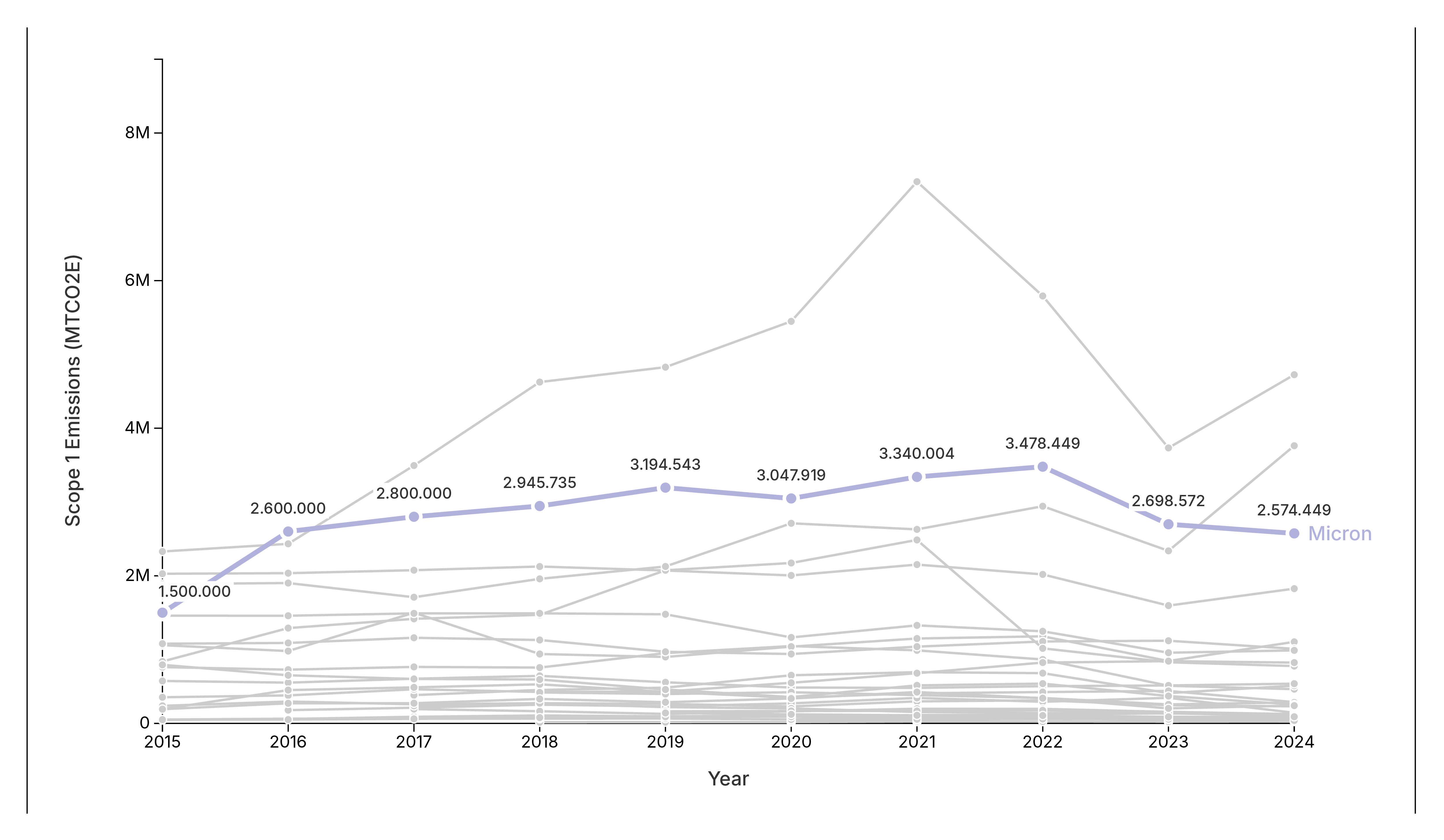 2 CSR reports typically measure GHG emissions in metric tons of carbon dioxide equivalents (MTCO2E). We are displaying the numbers in million metric tons of carbon dioxide equivalents (MMTCO2E). For more information on how emissions are measured according to the GHG Protocol, please refer to our 2025 publication: https://www.interface-eu.org/publications/semiconductor-emission-explorer.