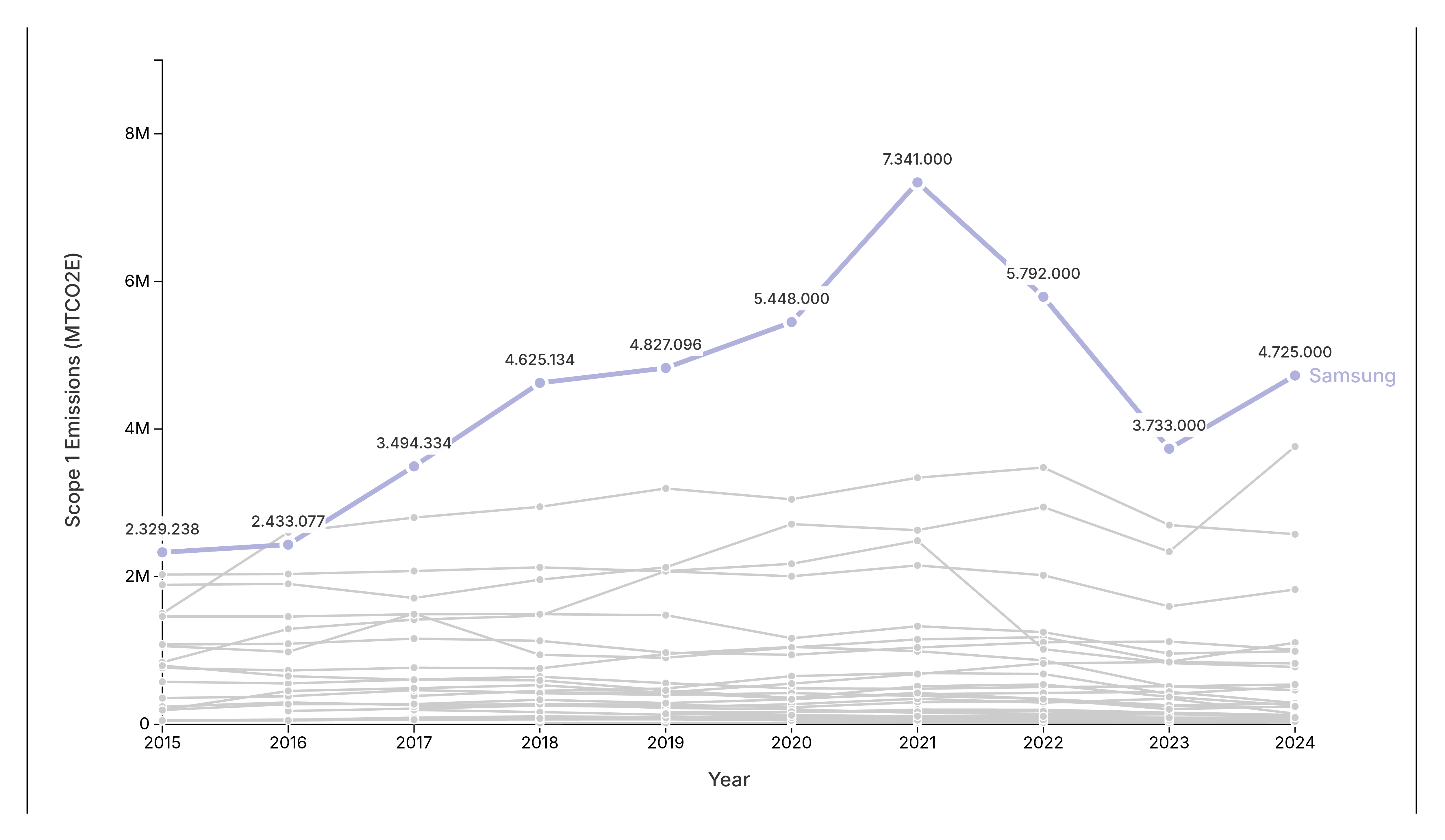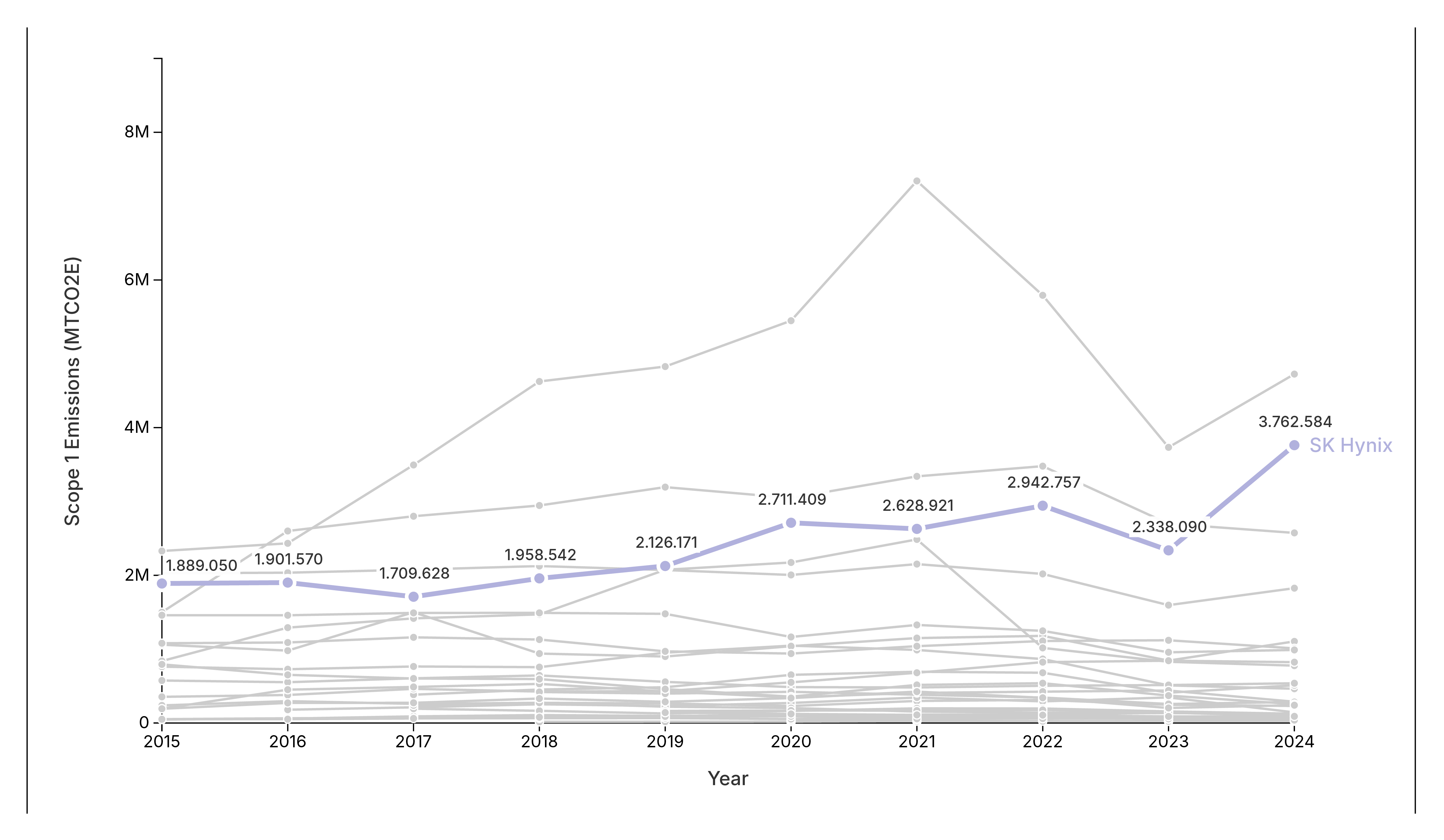 In our dataset, SK Hynix shows the largest increase in scope 1 emissions, which rose from 2.3 MMTCO2E to 3.7 MMTCO2E. This supports our hypothesis that the current surge in demand for DRAM – particularly HBM used in AI applications – is already influencing emission trajectories. Today, SK Hynix is the leading global supplier of HBM, supported by its close partnership with NVIDIA.