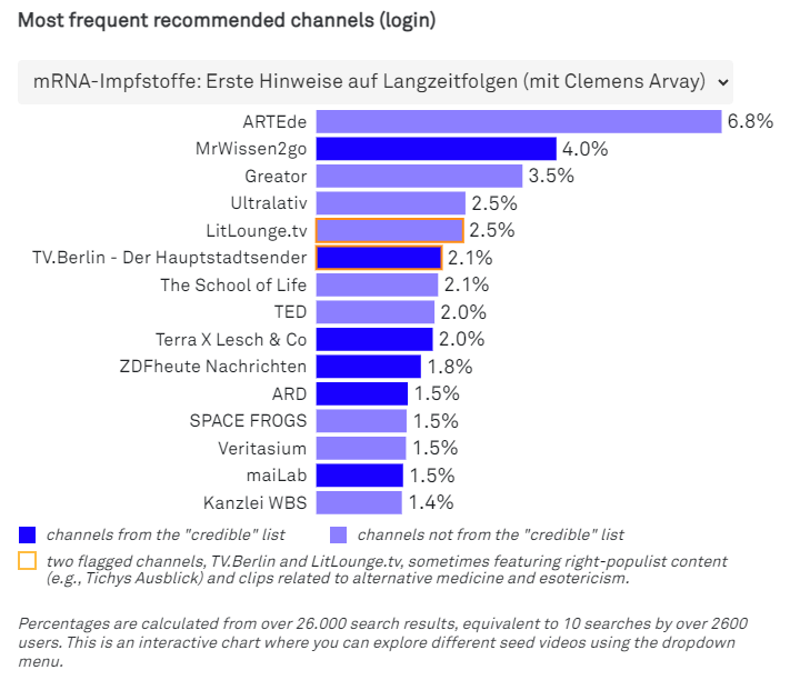 Analysis of the recommended channels associated with the seed videos reveals the two channels flagged by Der Spiegel: TV.Berlin and LitLounge.tv. These channels sometimes feature right-populist content (such as Tichys Ausblick) or clips from the field of alternative medicine and esotericism. The frequency of these channels in the recommendations is roughly 3%, leading Spiegel to conclude that certain users may encounter content that leads them in an unexpected or unwanted direction, but the probability is not very high.