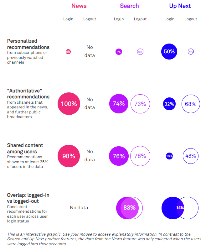 For example, while in our data the newsfeed and the search results are not defined by personal subscriptions and watch history, the Up Next recommendations are heavily influenced by them. Furthermore, as shown in the table, the features differ in how they work with "authoritative" sources, how similar the recommended content is across users, and how similar the recommendations are when a user is logged-in versus logged-out.