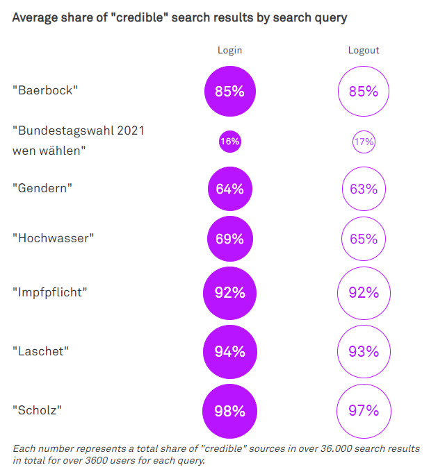 For the search feature we were able to compare the number of authoritative sources across seven search queries, namely "Baerbock", "Bundestagswahl 2021 wen wählen" (i.e. federal election 2021, who to vote for), "Gendern" (i.e. using gender-inclusive language), "Hochwasser" (i.e. flood), "Impfpflicht" (i.e. mandatory vaccination), "Laschet", and "Scholz". This allows for an examination of how the results vary across different queries and how they differ from the average number for the entire dataset.