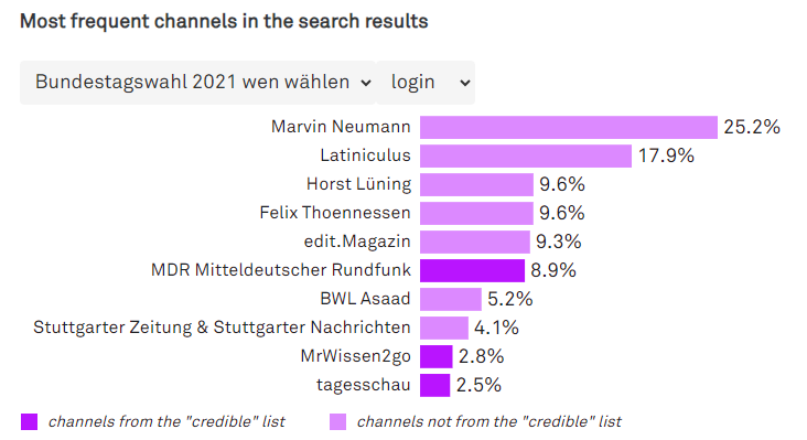 To examine why the numbers are so different across the search queries we looked at the most frequent channels for each search query. Our analysis identified one channel, "Marvin Neumann," that overwhelmingly dominated the search results for the query "Bundestagswahl 2021 wen wählen." It is worth noting that Marvin Neumann had previously participated in YouTube's Creator Program for Independent Journalists, a support program for freelance journalists on YouTube whose participants received a grant, best practices training and specialist support from YouTube. 7