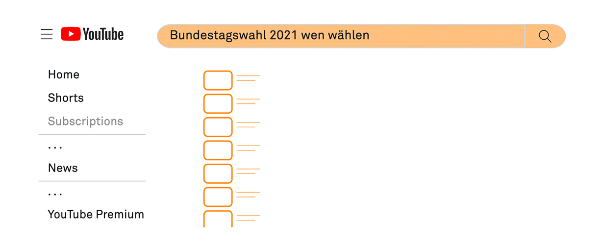 When a user types something in the search bar on YouTube, the website suggests a list of videos related to the search. For the search function experiment several political or federal election-related terms such as ‘Scholz’, ‘Baerbock’, ‘Laschet’, ‘Gendern’ (i.e. using gender-inclusive language), ‘Hochwasser’ (i.e. flood), ‘Impfpflicht’ (i.e. mandatory vaccination), and ‘Bundestagswahl 2021 wen wählen’ (i.e. federal election 2021, who to vote for) were selected. We looked at the first ten video suggestions for these seven search queries, first when the users were logged in, and then when they were logged out of their account. This enabled us to compare the results across different users, as well as across login/logout statuses for each user.