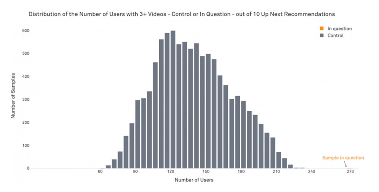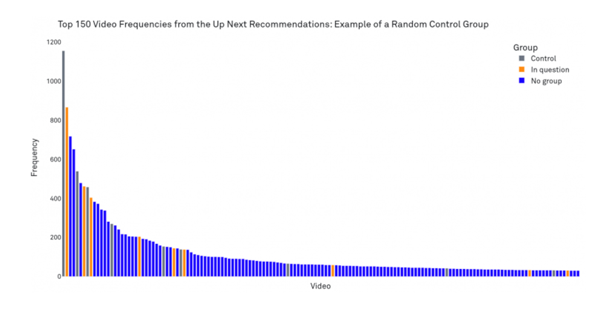 Only 68 users out of the total 3506 users (approximately 2%) were recommended three or more videos from the 25 control videos out of their set of ten recommendations. This number is significantly lower than the group of 273 users with 3 or more videos in question. However, one potential factor could be that the individual frequencies of the control videos are slightly lower.