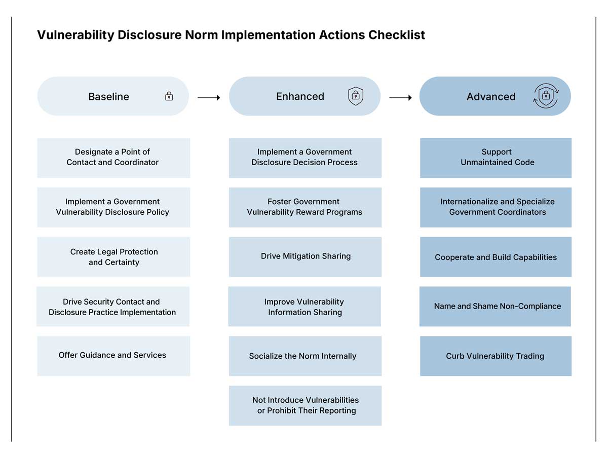 While this norm, among others, has been agreed on, its implementation needs to be advanced through concrete guidance. Implementation refers to “adjusting or establishing policies, procedures, regulations or capabilities or adopting other measures which support state and national adherence to the projected conditions of the recommendations for norms.” 4 This has recently been emphasized again by several governments calling for an improved exchange, in-depth discussions and collaborative initiatives on vulnerability disclosure, and the vulnerability disclosure norm more specifically. 5 This policy paper therefore seeks to bridge the gap between the abstract formulation of the United Nations norm on vulnerability disclosure and its implementation in practice. It offers concrete, actionable guidance on how states – key stakeholders and enablers of vulnerability disclosure – can achieve compliance.