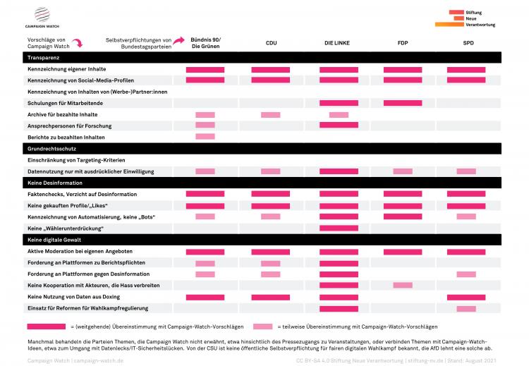Der Bundestagswahlkampf 2021 war der erste, bei dem sich mehrere große deutsche Parteien Richtlinien für faire (digitale) Kommunikation gaben. Diese Entwicklung zeigte, dass Parteien dem Thema „fairer digitaler Wahlkampf“ mehr Aufmerksamkeit beimaßen als noch vor einigen Jahren. Allerdings geschah dies erst nach Druck aus Forschung und Zivilgesellschaft und aus Ermangelung an klaren gesetzlichen Regelungen zu digitalen Wahlkämpfen. Solche Gesetzeslücken müssen langfristig geschlossen werden, damit Bürger*innen sich nicht auf freiwillige Kodizes der Parteien im Umgang mit ihren Daten, für transparente Onlinewerbung und zur Eindämmung von Hassrede und Desinformation verlassen müssen. Dieses Kapitel beleuchtet, wie es zu den Selbstverpflichtungen kam, was sie umfassten, wie sie gewirkt haben und welche Schwächen sie hatten.