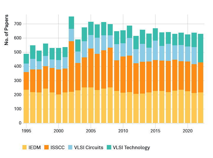 We analyzed 28 years (1995–2022) of invited papers from three leading global semiconductor conferences: the International Electron Devices Meeting (IEDM), the International Solid-State Circuits Conference (ISSCC), and the Symposia on VLSI Technology and Circuits (VLSI). In total, our dataset consists of 6299 IEDM papers, 6036 ISSCC papers, and 5183 VLSI papers. Before 2022, papers invited to the two VLSI conferences (green and blue bars) were disclosed separately. Since 2022, VLSI Circuits and VLSI Technology have been officially recognized together as VLSI Technology (green bar). The following charts do not differentiate between the two. For more background on those conferences, please have a look at our first data brief, Who is developing the chips of the future?, from 2021.