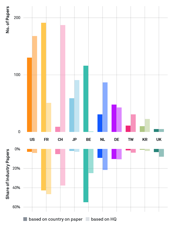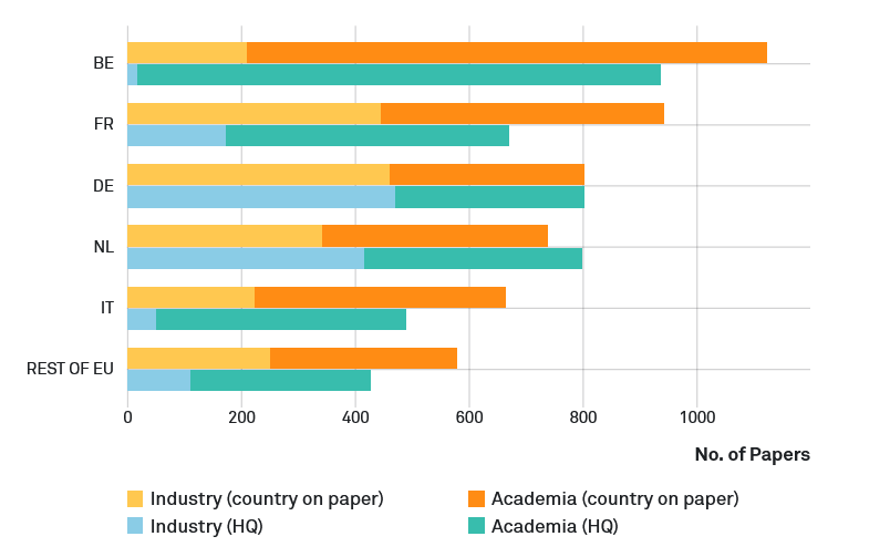 The extent to which this difference can have a concrete impact is shown by the special case of STMicroelectronics in France, Italy, and Switzerland. The substantial drop in total papers based on headquarters location (shorter blue/green bar versus yellow/orange bar) in both France and Italy can be mainly attributed to STMicroelectronics, France’s largest semiconductor company. STMicroelectronics has most of its R&D and production in France and Italy, but its legal headquarters is in Switzerland, which is not part of the EU and thus does not show up in the blue/green bar. The company accounts for 301 French industry papers (yellow bar) and 139 Italian industry papers.