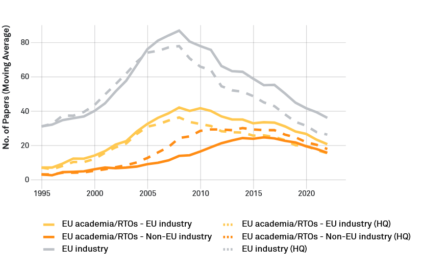 Importance of research collaboration with non-EU industry: Since 2011, the dashed orange line (research collaborations with non-EU industry based on headquarters) has been higher than the dashed yellow line (research collaborations with EU industry based on headquarters). This shows that since 2011, EU academia/RTOs have had more research collaborations with companies headquartered outside of the EU than with companies headquartered in the EU.