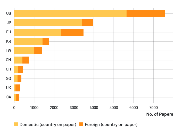 Chart 2 shows the total number of papers (1995–2022) coauthored by one or several domestic institutions (yellow) or in participation with at least one foreign institution (orange). In our analysis, we either affiliate a country based on the affiliations listed in the paper or based on the company’s headquarters. This chart is based on the country stated as part of the author’s affiliation (country on paper). For example, a paper coauthored by Author A (Intel, Jerusalem, Israel) and Author B (Intel, Hillsboro, United States) would count as a foreign collaboration for the US and Israel. Affiliations with Hong Kong are counted as China’s in our analysis.