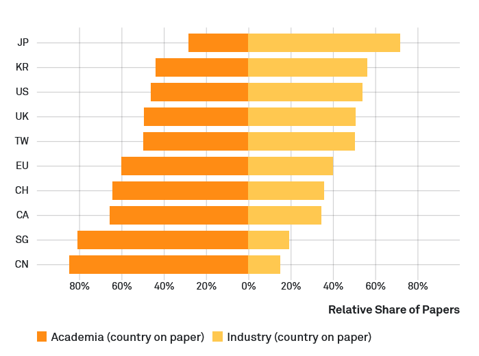 A side note: For most of the countries mentioned, the trends of contributed papers are very different when comparing industry and academia.