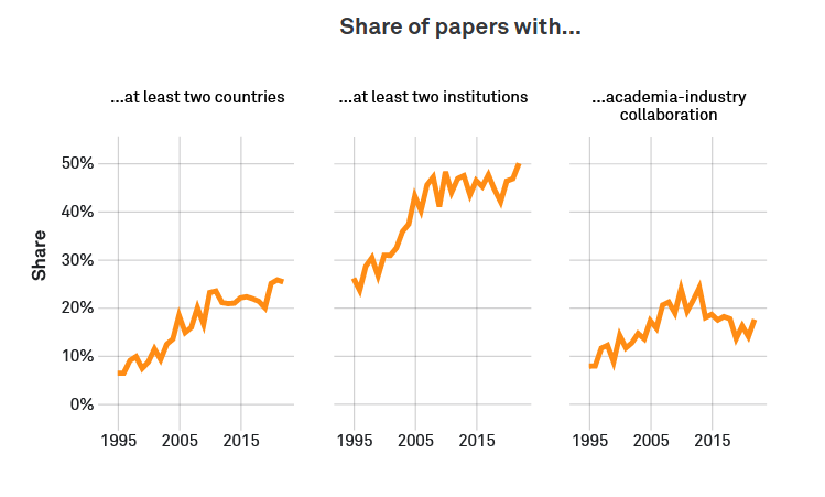 Second, international collaboration seems to have plateaued. Since around 2010, global research collaboration has stagnated and even declined in some cases, although there was no decrease in the overall number of contributed papers.