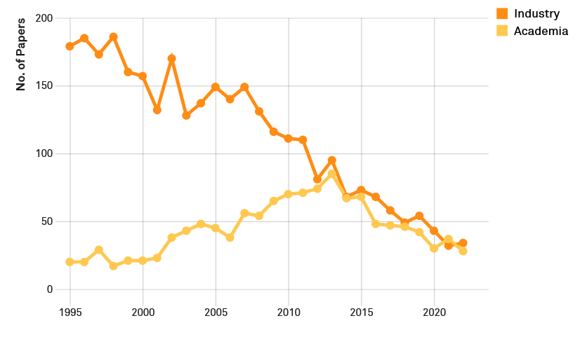 First, academia took over. Interestingly, industry seems less eager today than 20 years ago to showcase their research at international conferences. The share of papers with industry contributions has declined substantially since the early 2000s.