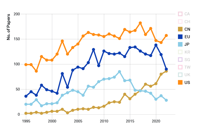 Chart 7 is an interactive chart for comparing academic or industrial research power between different countries. You can toggle between the country identification by an organization’s headquarters or the country stated on paper. The chart is preset to give an overview of the development of academic research power measured in paper submissions from China (CN), the European Union (EU), Japan (JP), and the United States (US) over the last 28 years.