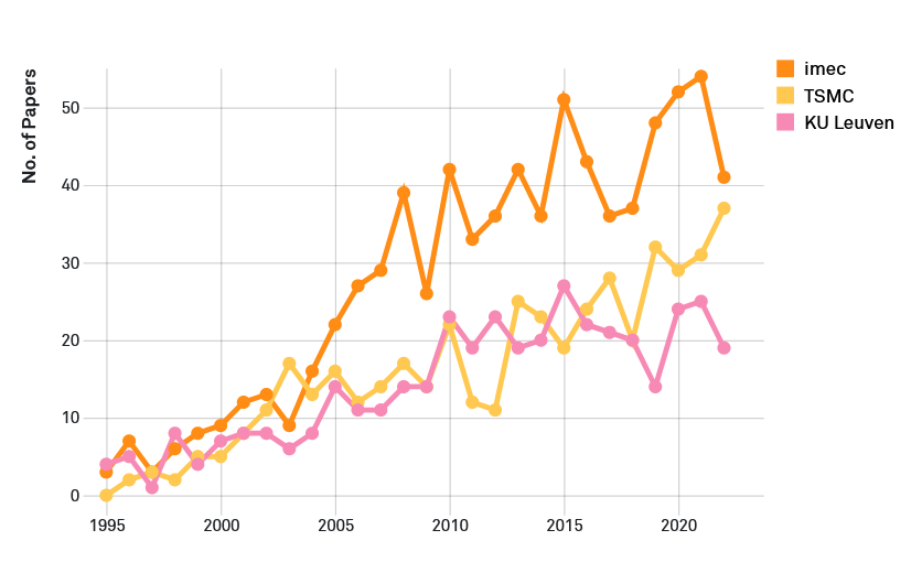 Chart 8 is an interactive chart of the top 20 institutions from academia and industry based on the total number of invited conference papers from 1995–2022. This means that these are not the top 20 institutions today but the top 20 based on their cumulative research in the last 28 years. Academia here includes universities, academic institutions, and RTOs. From the 40 institutions that can be selected from the chart, we preselected imec, TSMC, and KU Leuven.