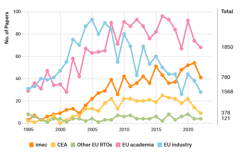 Paper contributions from imec have also started growing significantly. From 2005 to 2010, imec doubled its published papers from 20 to 40 per year. CEA’s growth period has already started in 2000 and has leveled off around 20 papers per year since 2010.